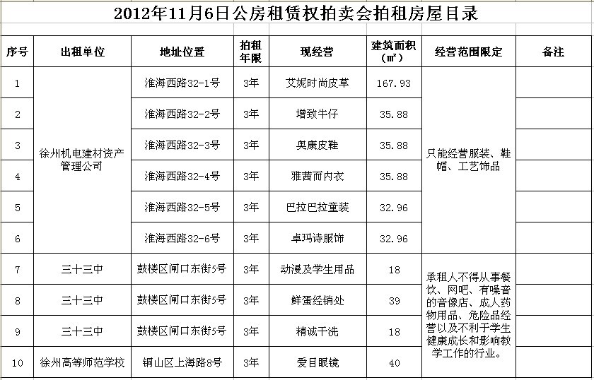 1、徐州淮海西路32#自東向西1-6號(hào)門面房共6間,建筑面積分別為167.93㎡、 35.88㎡、32.96㎡。以上房屋僅限經(jīng)營(yíng)服裝、鞋帽、工藝飾品。
