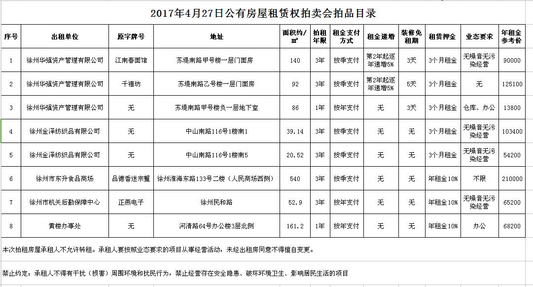 關(guān)注微信公眾號我公司受委托,定于2017年4月27日10時開始,通過中國拍賣行業(yè)協(xié)會網(wǎng)絡(luò)拍賣平臺(http://pm.caa123.org.cn),以網(wǎng)絡(luò)競價的方式公開拍賣公有房屋租賃權(quán)一批,租賃期限均為3年,以下房屋均為空房: