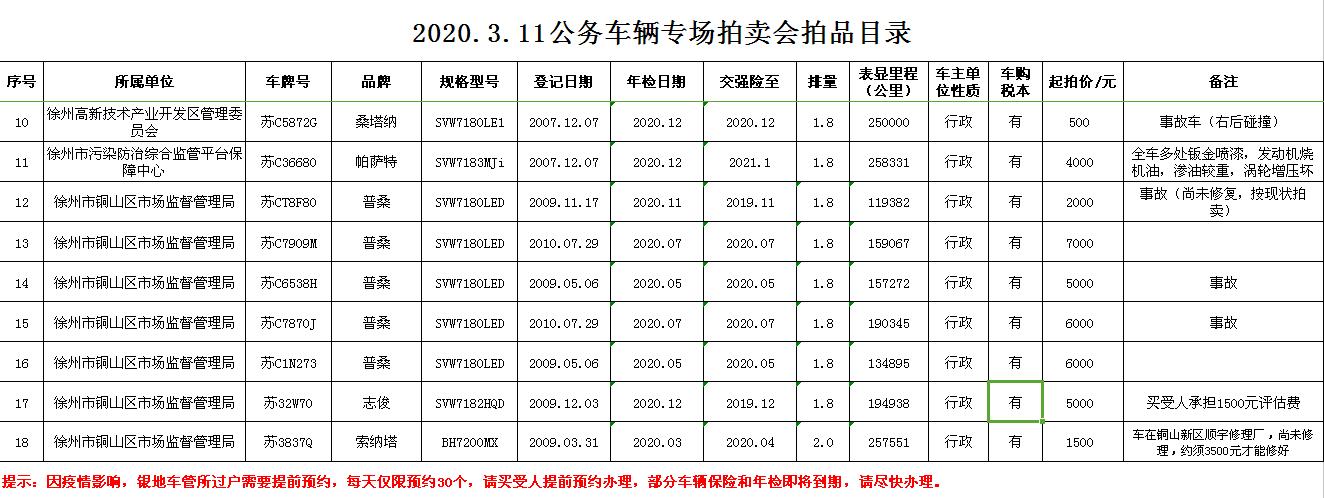 受委托,我公司定于2020年3月11日13:00時在徐州市銀地二手車交易市場四樓東南拍賣大廳通過現(xiàn)場和汽車街網(wǎng)絡(luò)拍賣平臺同步進(jìn)行的方式公開拍賣以下公務(wù)車輛: