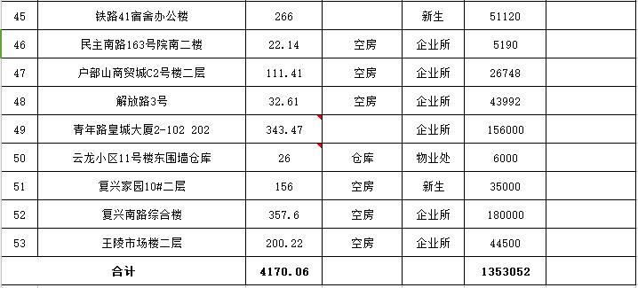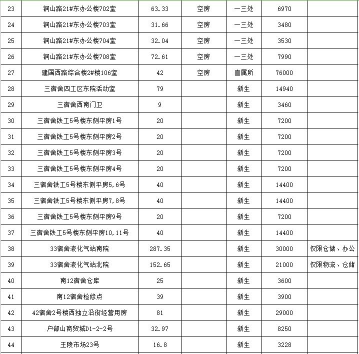 位于銅山路21#辦公房屋15處;位于建國(guó)西路2號(hào)樓辦公房屋5處;位于鐵路3宿舍10處、33宿舍2處、南12宿舍2處、41-42宿舍2處,其他分別位于王陵市場(chǎng)、復(fù)興南路、戶部山商貿(mào)城、皇城大廈、解放路3號(hào)、南門(mén)橋綜合樓等地。